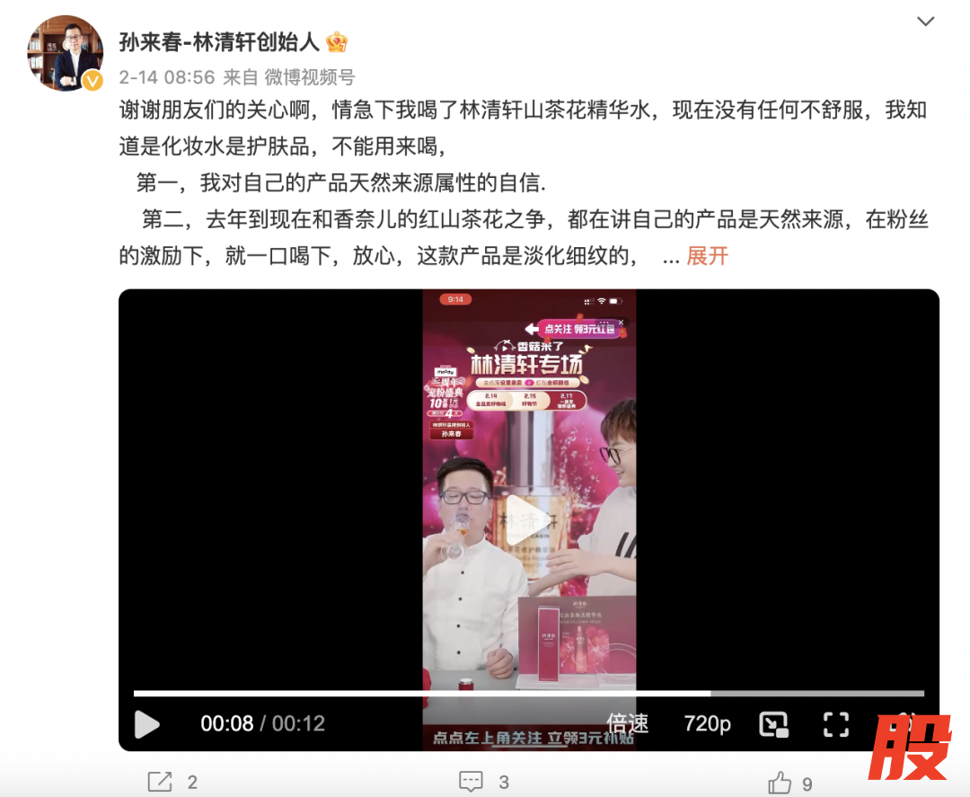 随后,孙来春在个人社交媒体账号上对此事回应称:“情急下我喝了林清轩山茶花精华水,现在没有任何不舒服。”他还补充说到,化妆水不是按照食品设计的,希望大众不要学习。